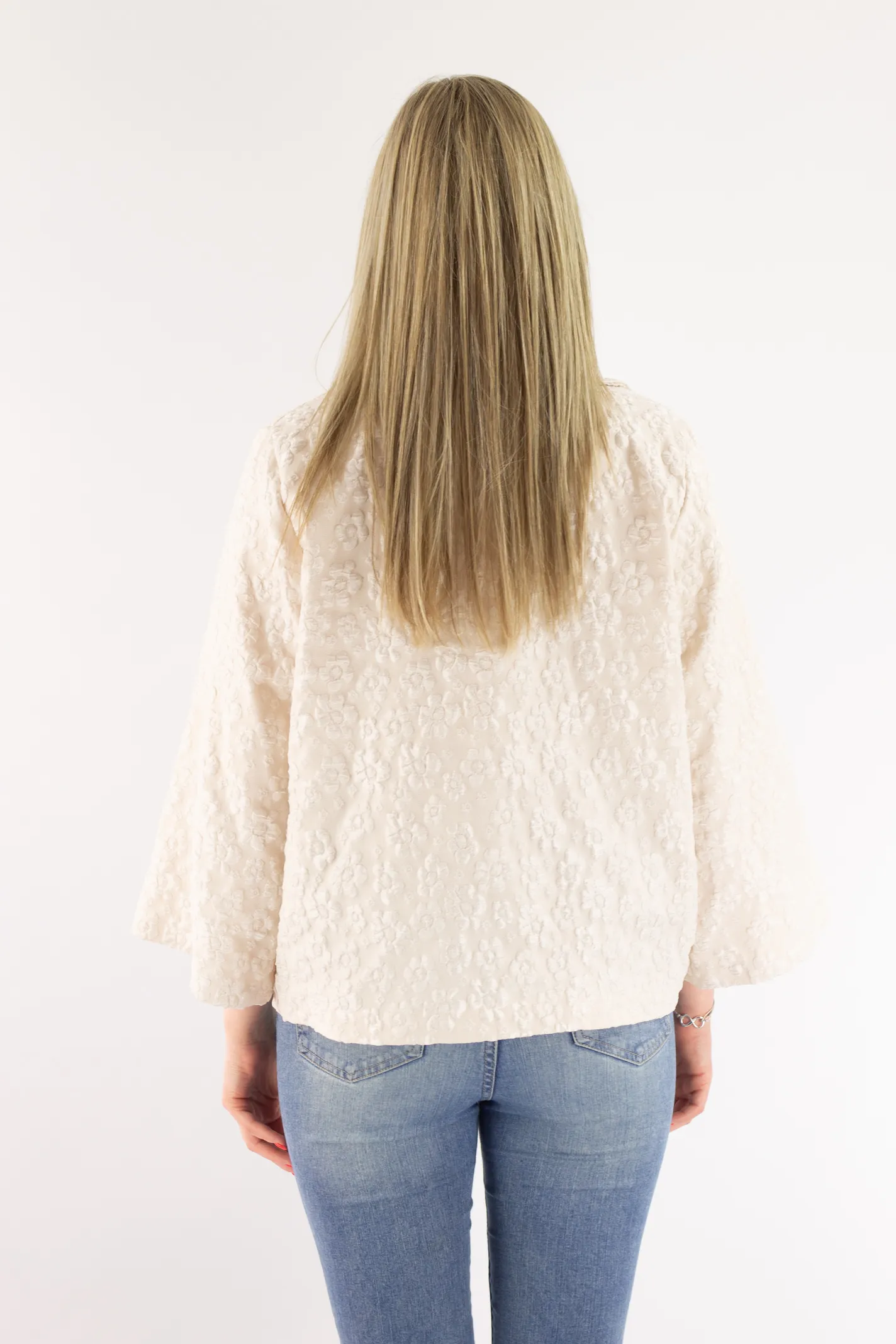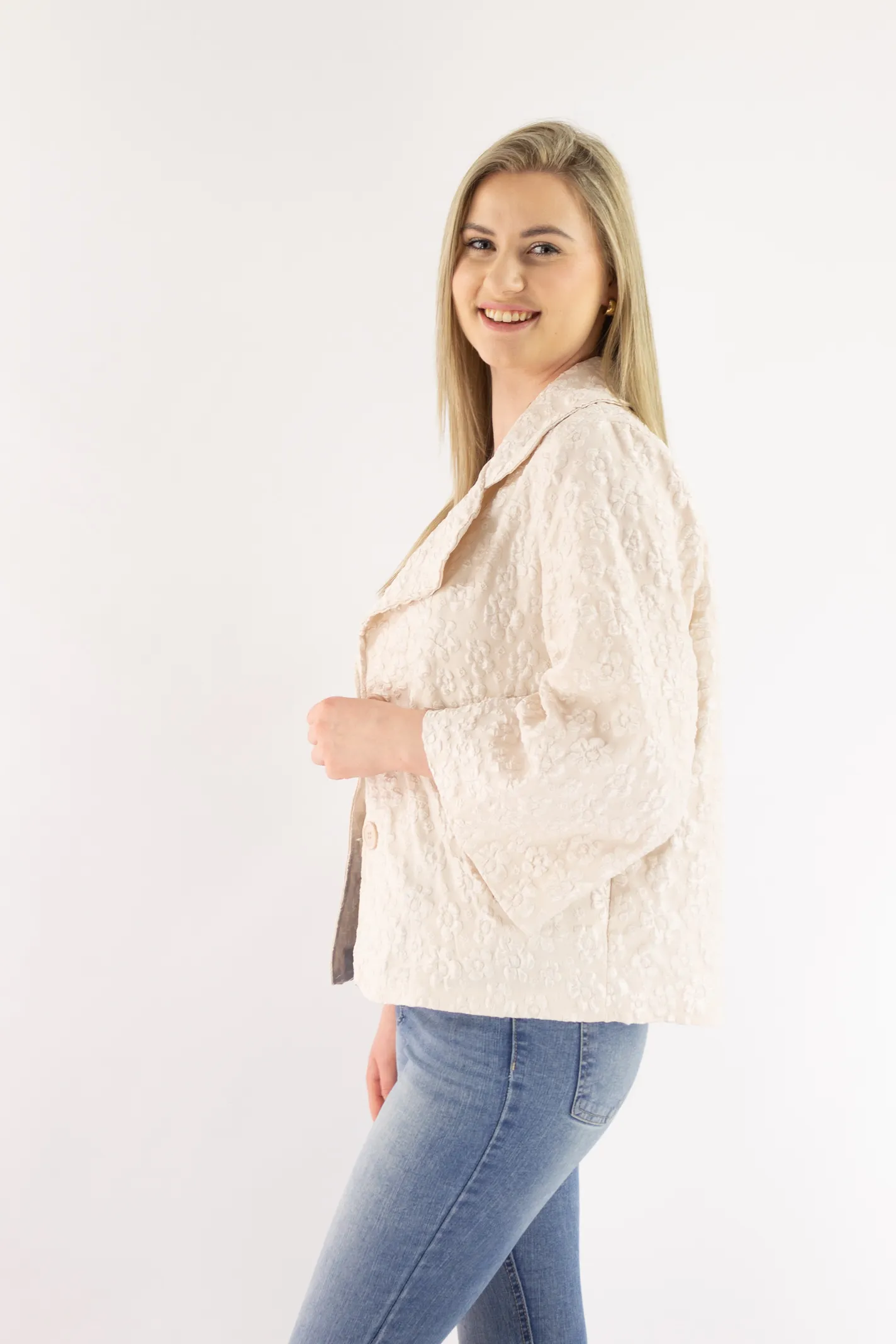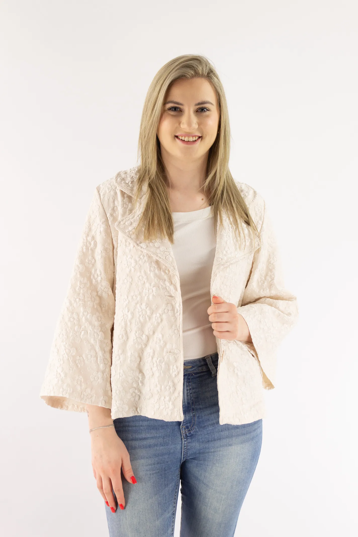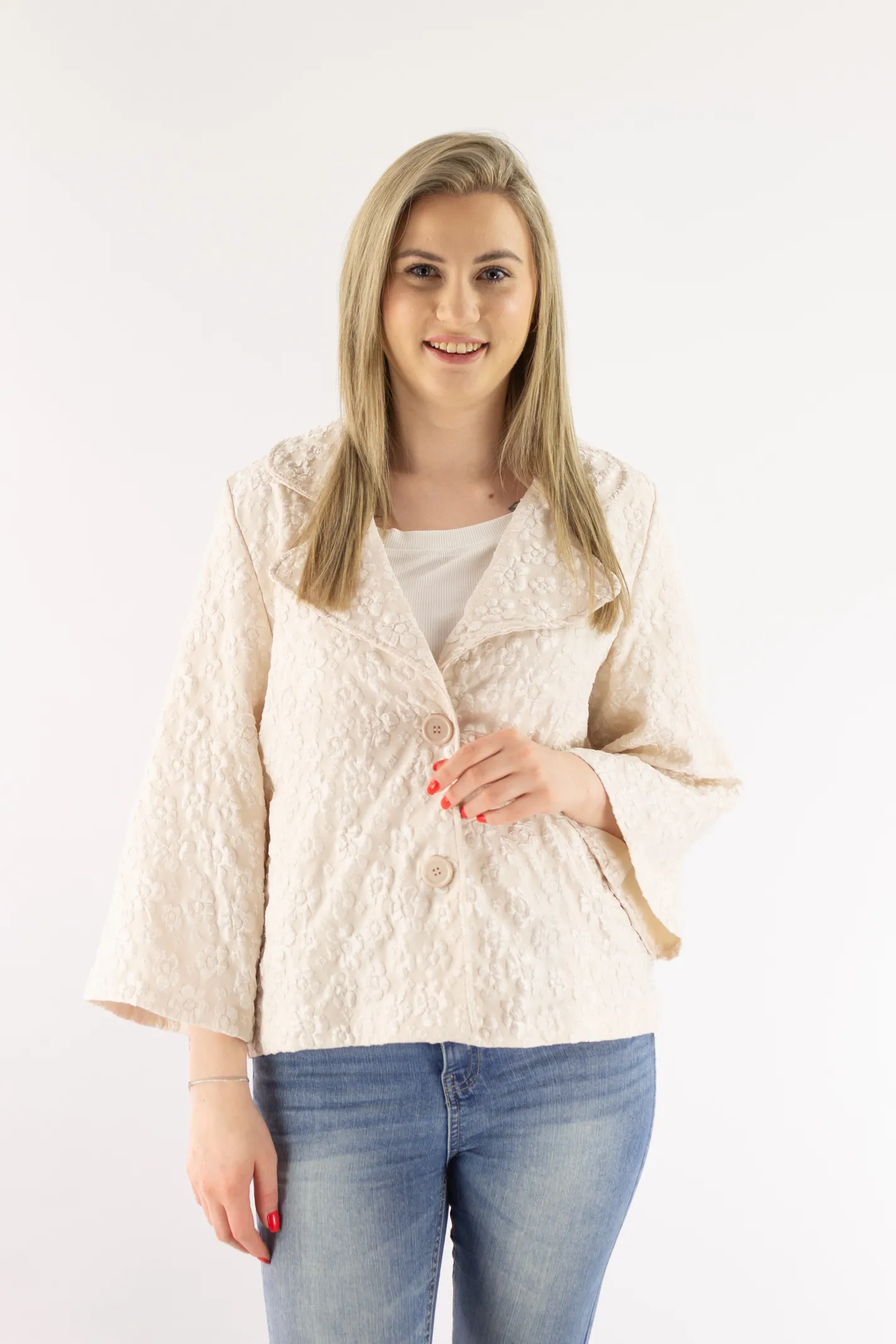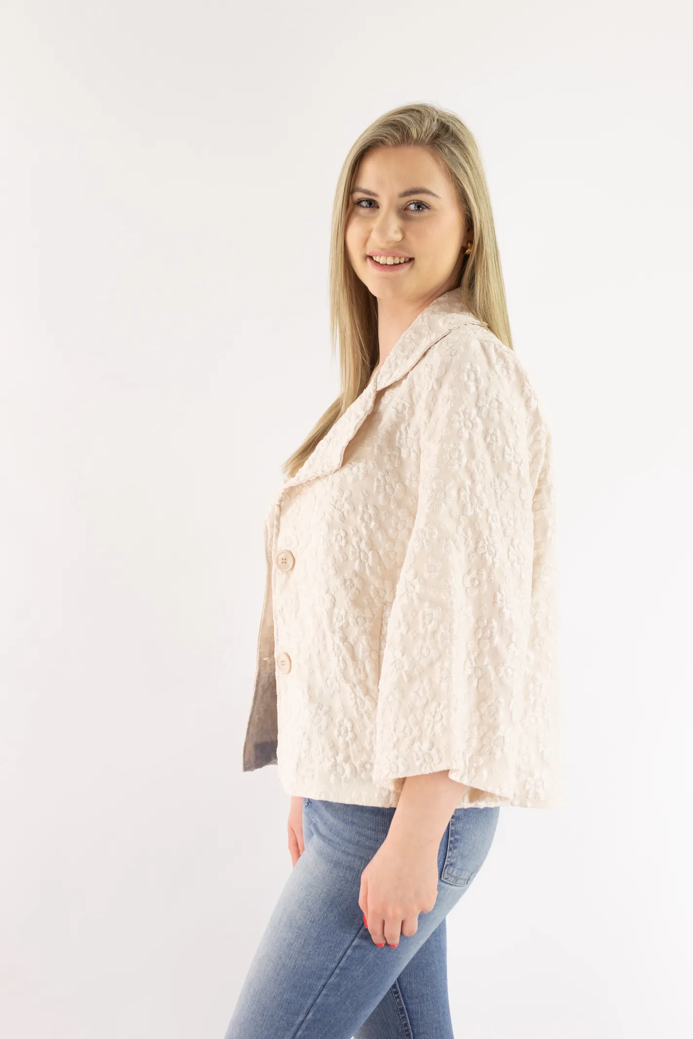Krótki płaszczyk z wytłaczanym kwiatowym wzorem beżowy