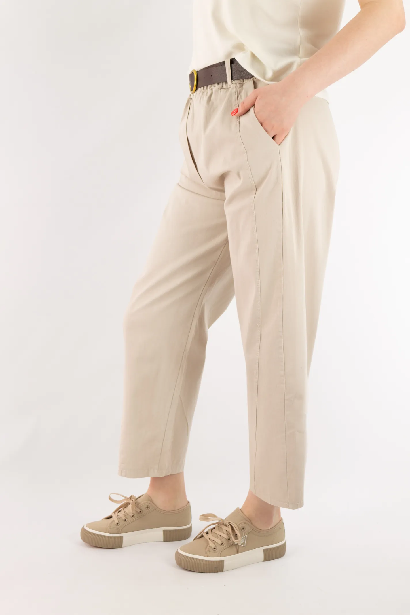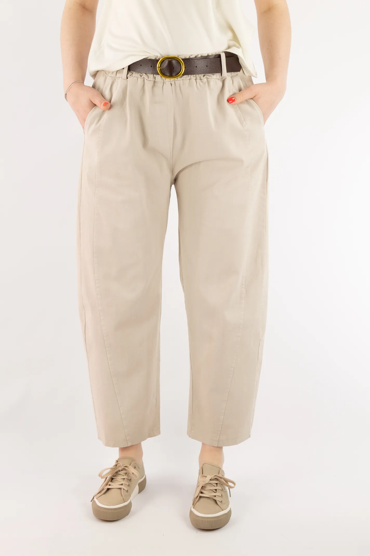Spodnie bawełniane balloon z paskiem beżowe
